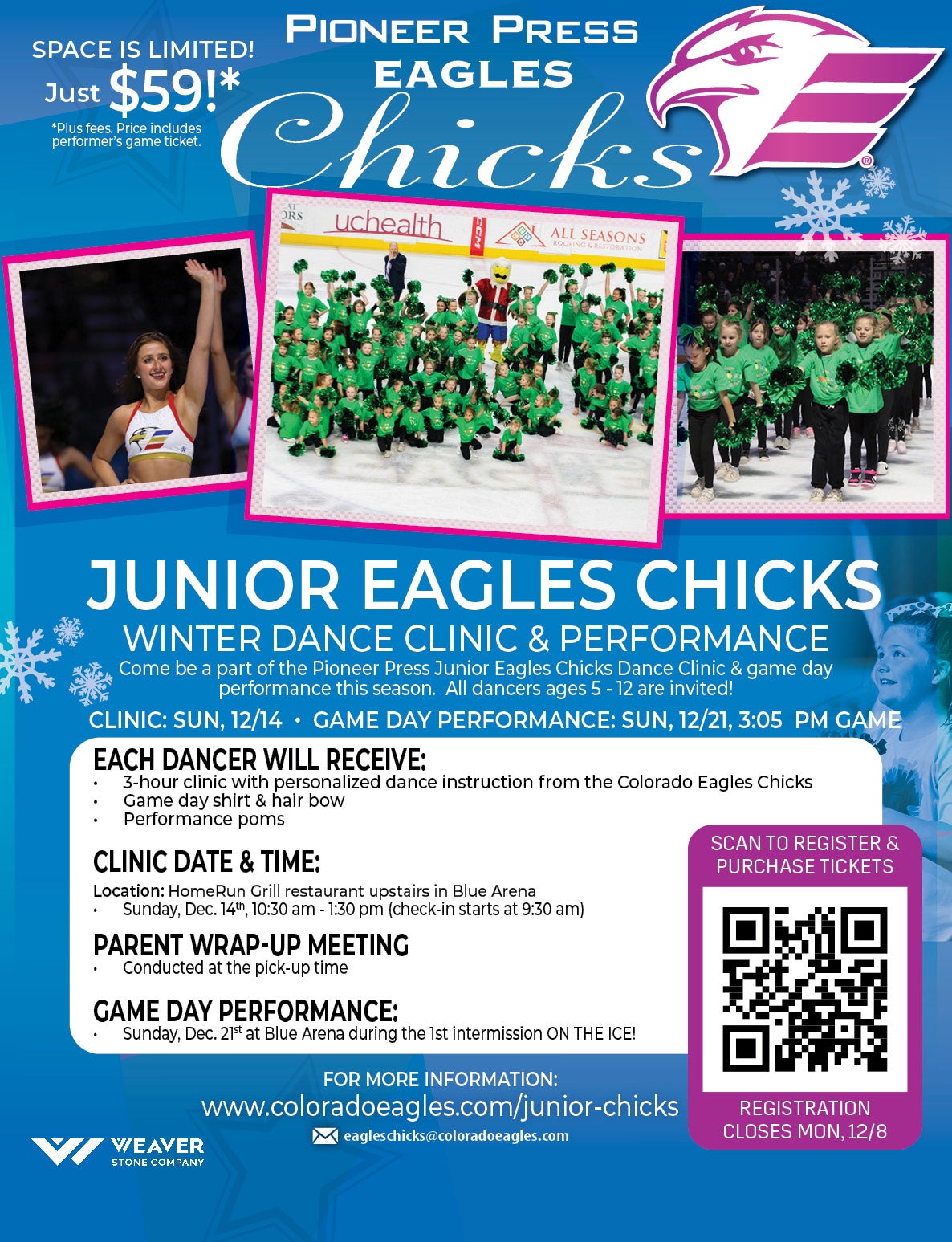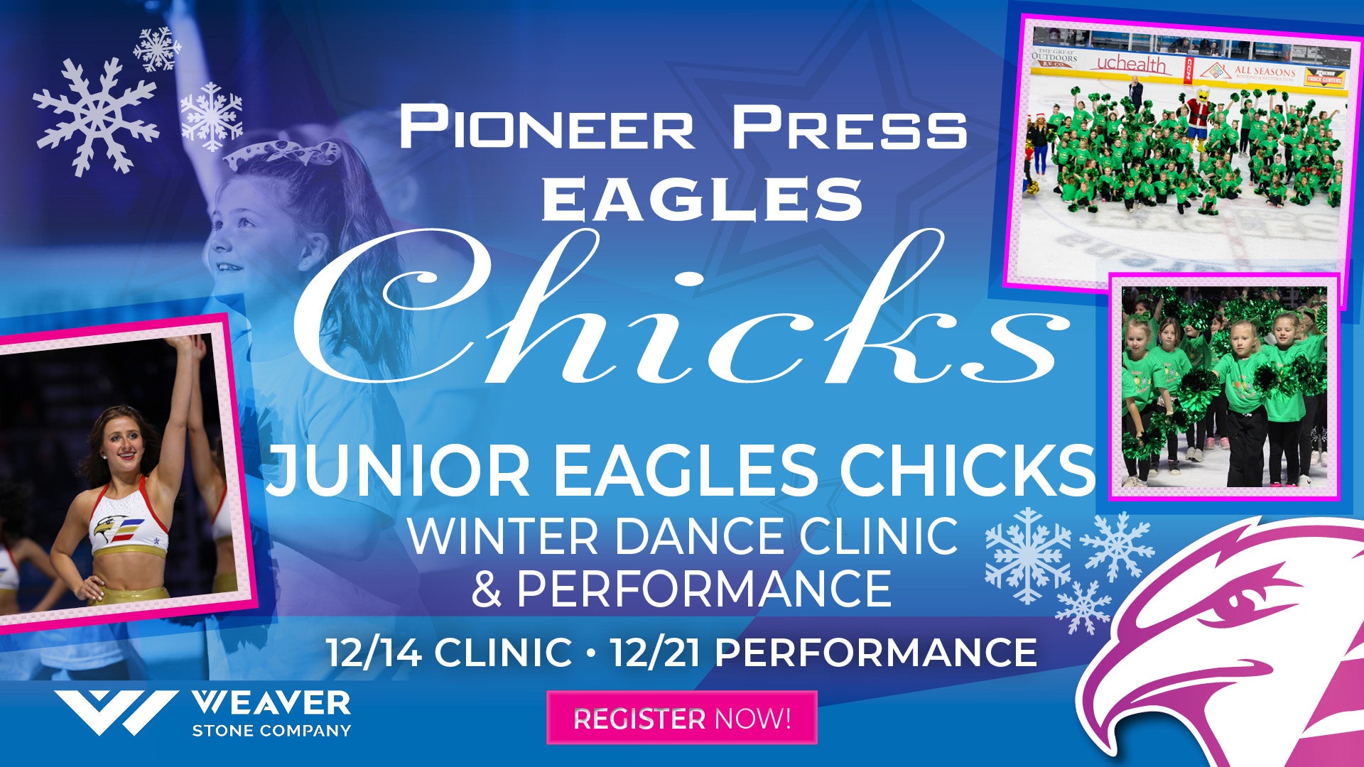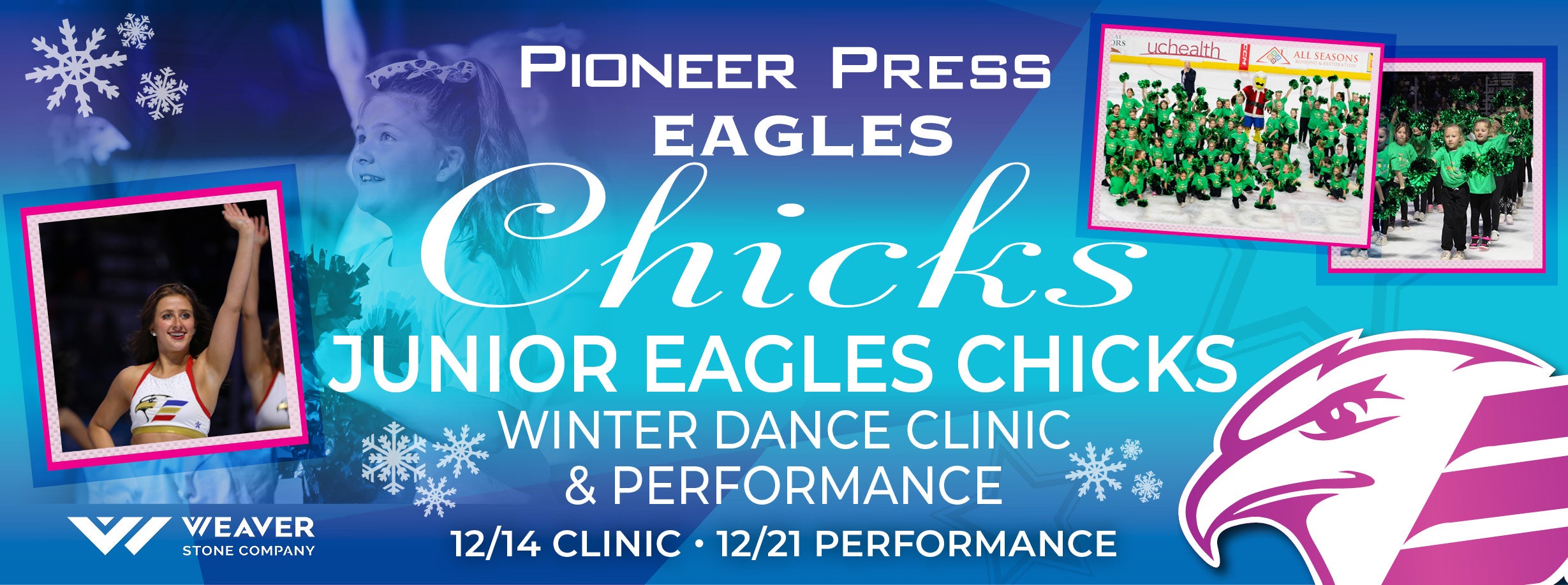 Come join the Pioneer Press Eagles Chicks as we host another Junior Eagles Chicks dance program this season! Available for children ages 5-12, this clinic will provide an experience your child won’t soon forget! Junior Eagles Chicks will also have the opportunity to dance at the Colorado Eagles game and work with the Eagles Chicks at a private clinic, receive a performance shirt and poms, as well as dance with the Eagles Chicks throughout the game. Don’t miss this great opportunity!