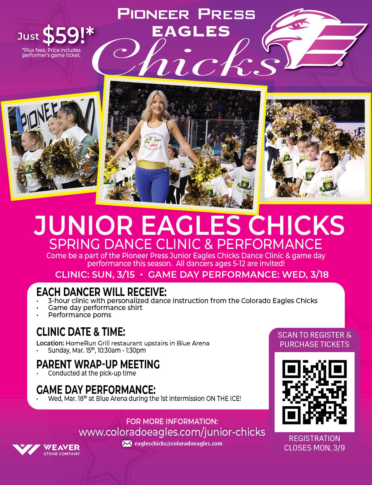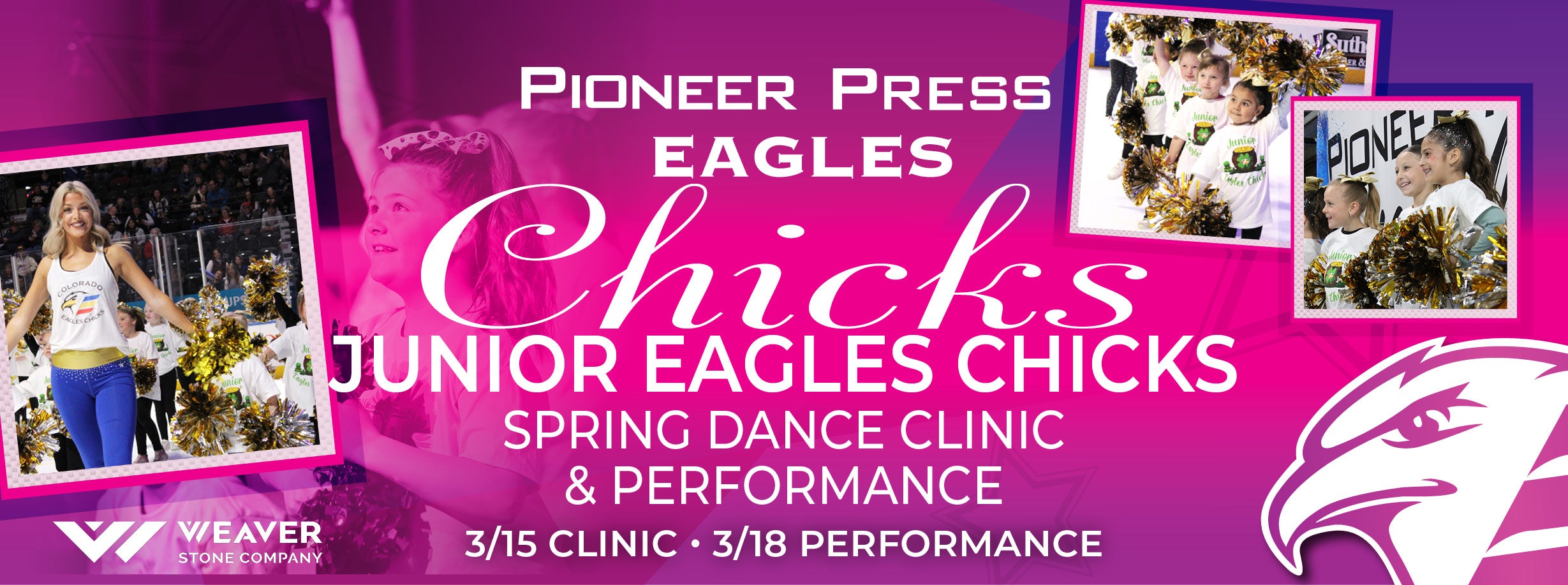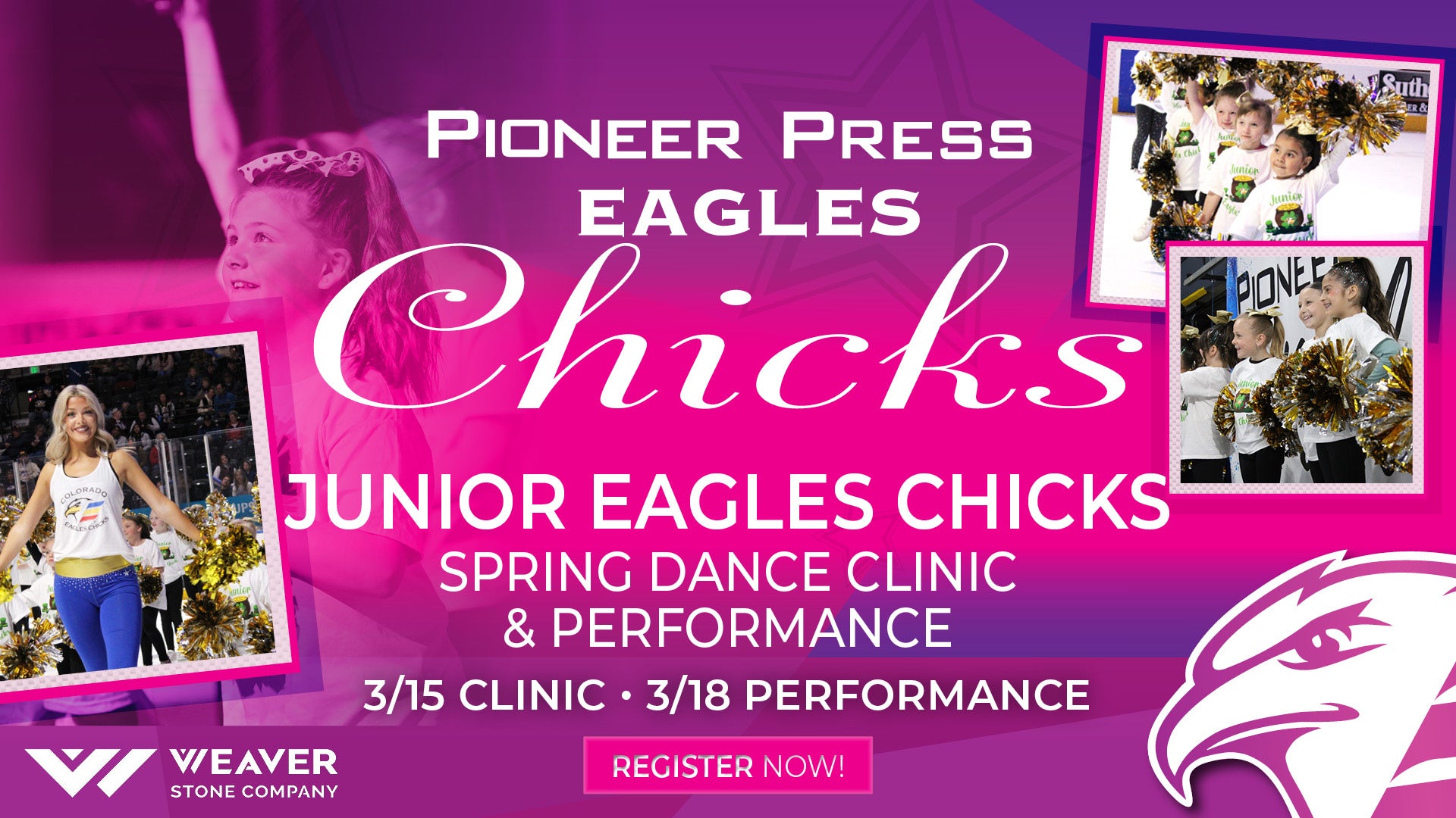 Come join the Pioneer Press Eagles Chicks as we host another Junior Eagles Chicks dance program this season! Available for children ages 5-12, this clinic will provide an experience your child won’t soon forget! Junior Eagles Chicks will also have the opportunity to dance at the Colorado Eagles game and work with the Eagles Chicks at a private clinic, receive a performance shirt and poms, as well as dance with the Eagles Chicks throughout the game. Don’t miss this great opportunity!