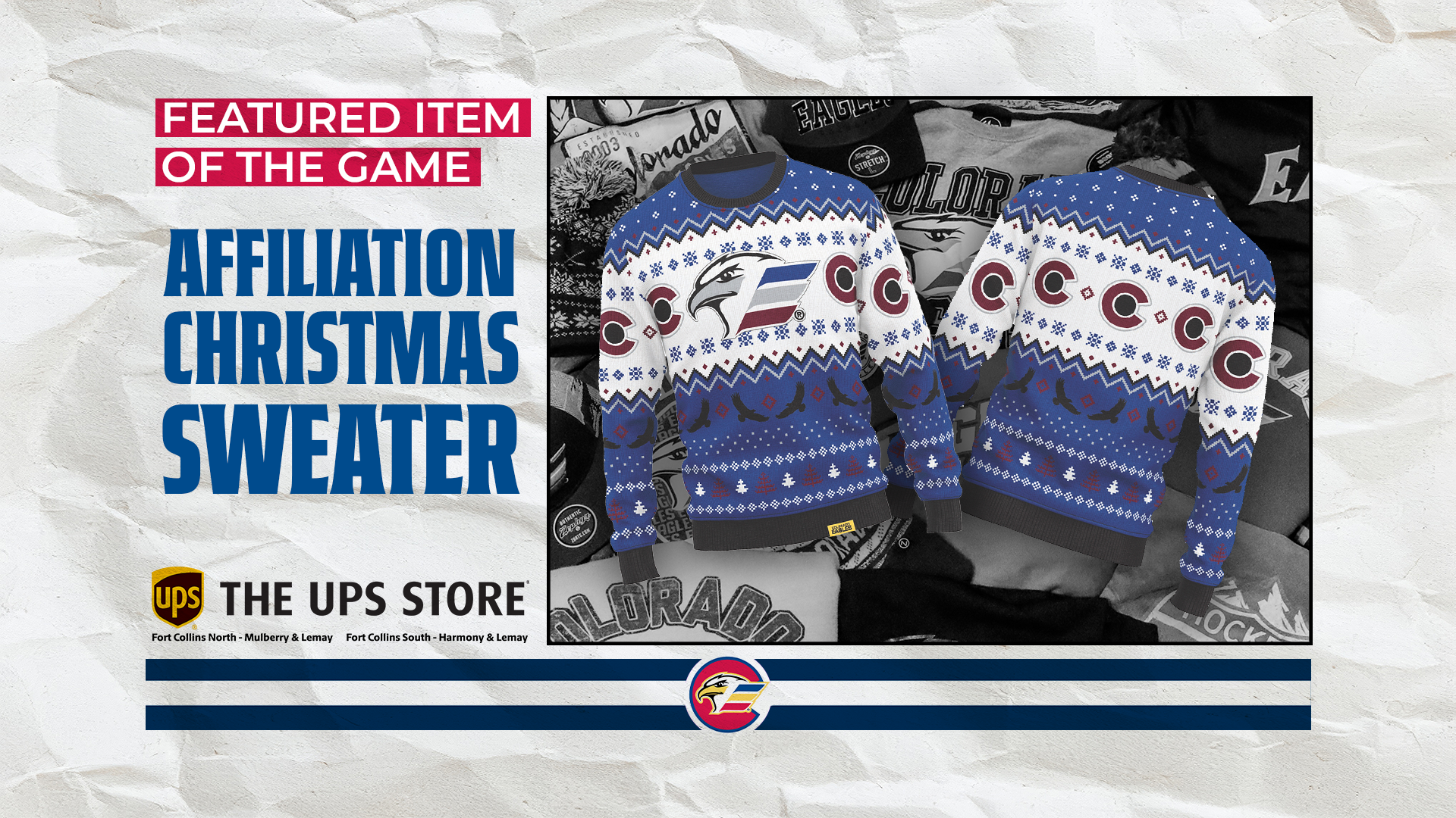 Tonight’s Featured Merchandise is the Affiliation Christmas Sweater. These sweaters feature woven logos and designs perfect for getting in the holiday spirit. Find these sweaters and many other great products at the Eagles Merchandise stands located behind sections J and V, powered by the UPS store of Fort Collins.