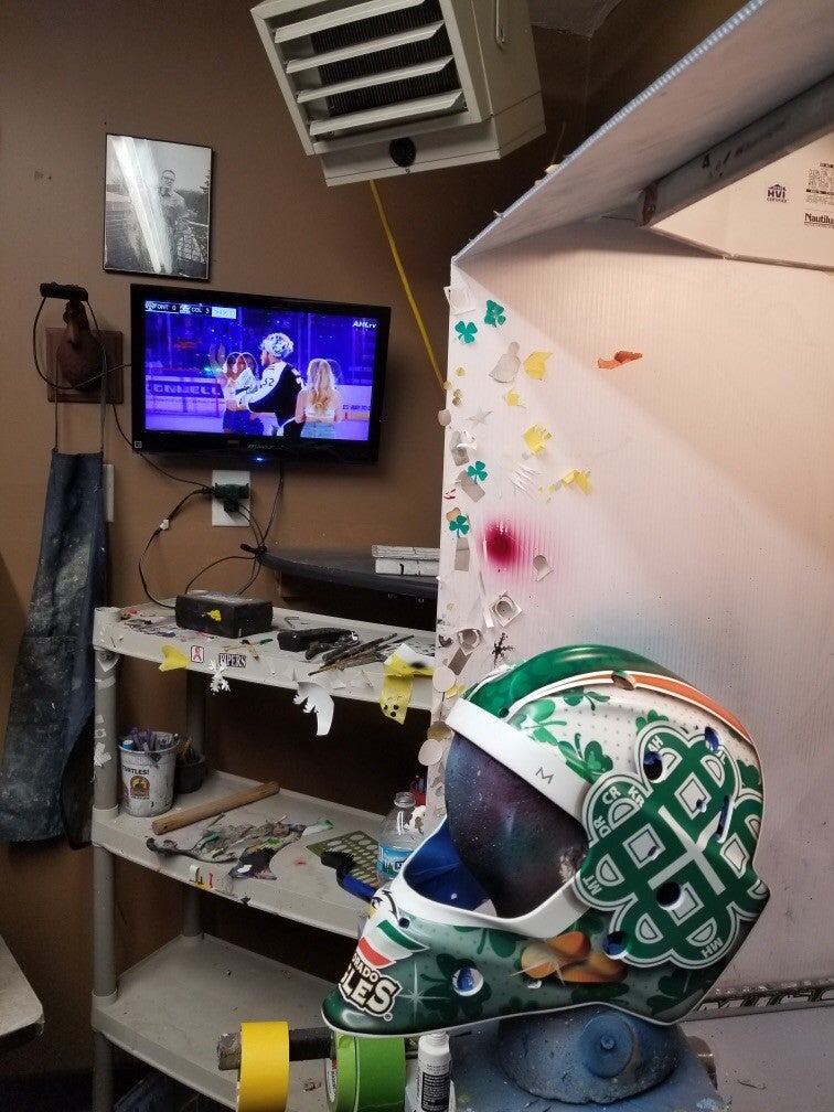 "I'm pretty fortunate that my dad gets to do my masks and it's allowed me to do some masks over the years for different causes that I support," said Hunter Miska about the opportunity to do a Pot of Gold mask. "When I heard about the game and the cause behind the game I knew I could create a special mask that would