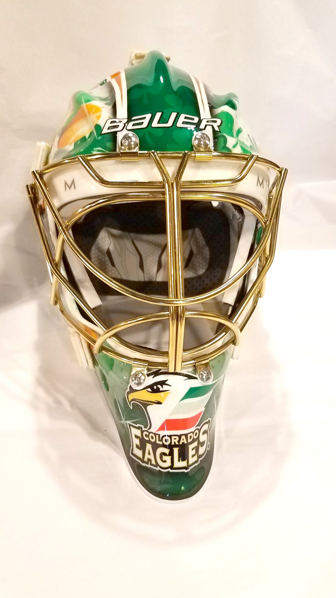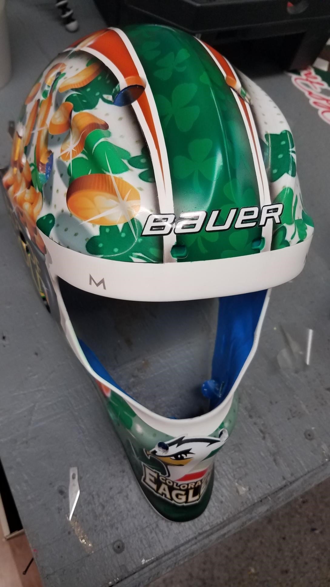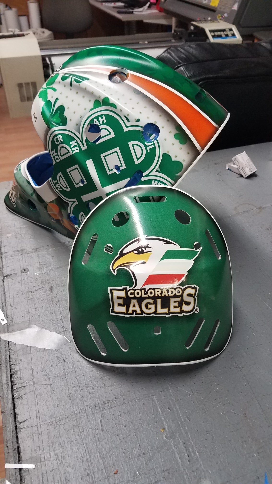 "On the chin, I have the Eagles logo with the feathers colored as the Irish flag. Then going up the front I have just a couple of lines with the orange and green one down the middle and then in the background I have some four-leaf clovers shadowed in. So pretty cool design, and then on the backplate I've got the same Eagles logo with the feathers colored as the Irish flag."