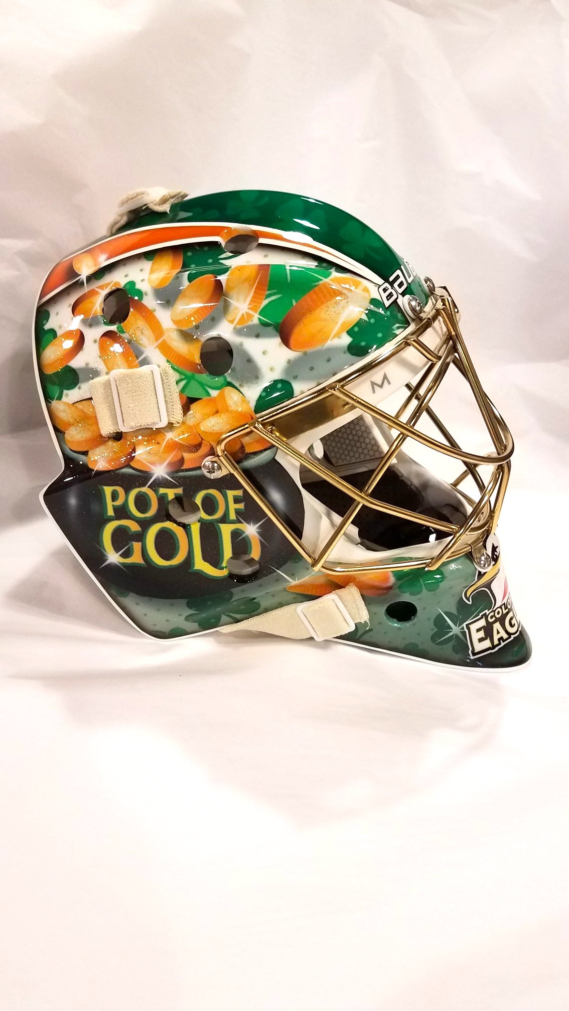Eagles goaltender Hunter Miska wanted to add to this year's Pot of Gold auction in a unique way. For the first time ever, a Pot of Gold goalie mask was created! Hunter, along with his dad Todd Miska and Bauer representative Tim Boron, set out to create a unique Pot of Gold mask in hopes of raising more money for Jayce and the Vogel family.