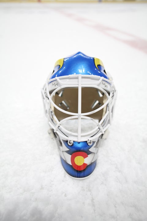 Eddie Belfour wore the same mask, and Gary passed away this past year so I wanted to do a little tribute to him too, that's why I have the MW here, for Miska Warwick. That's what my dad used do back in the day so we did like a little throwback. On the chin here I got the Colorado flag, I thought it fit in pretty cool with the design and to fill in some space on there.
